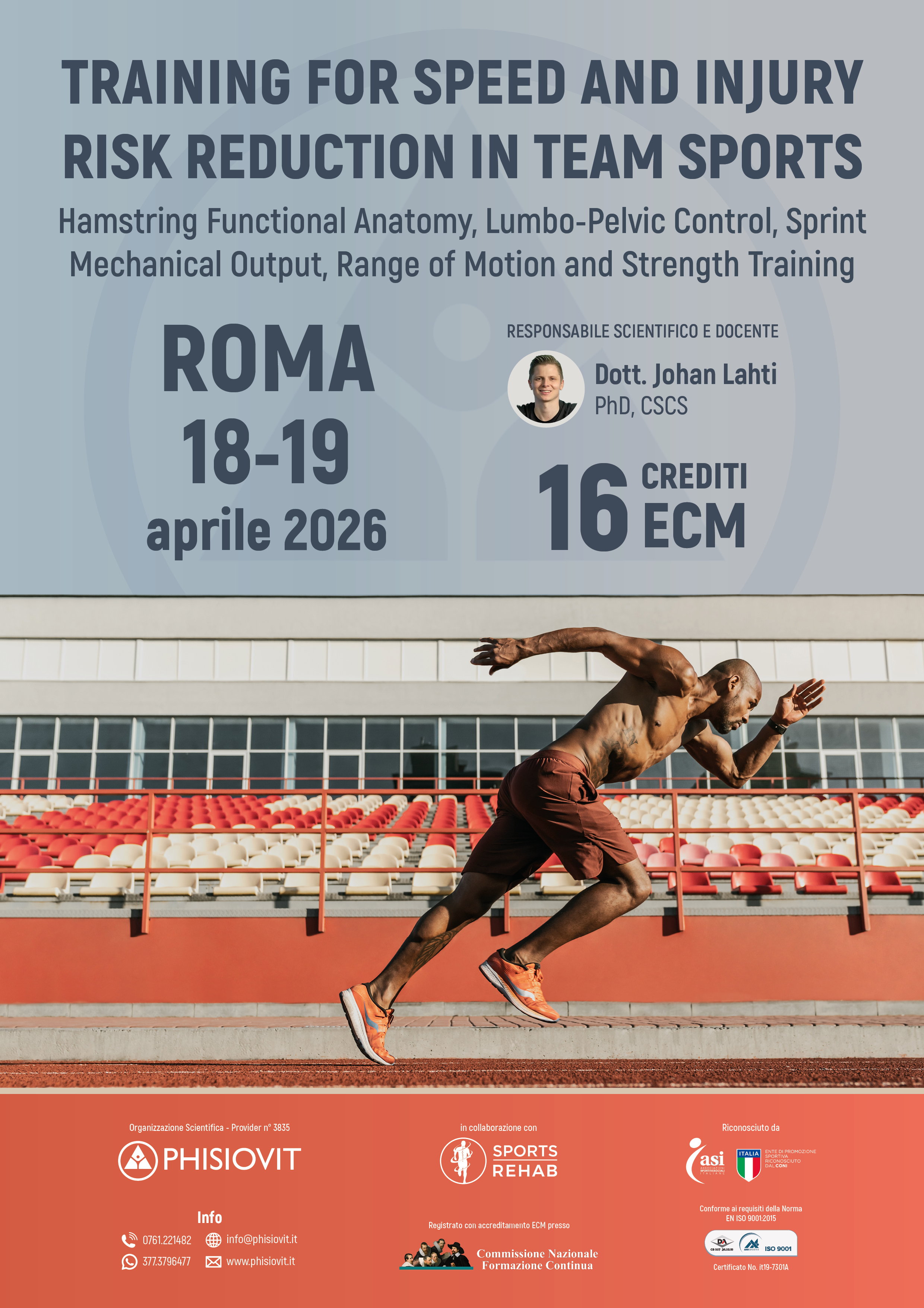 Il corso, della durata di due giorni consecutivi (18-19 aprile 2026), dal titolo Training for Speed and Injury Risk Reduction in Team Sports: Hamstring Functional Anatomy, Lumbo-Pelvic Control, Sprint Mechanical Output, Range of Motion and Strength Training, è tenuto dal Dott. Johan Lahti, PhD, CSCS. Il corso è in lingua inglese con traduzione consecutiva in italiano. Sono previsti traduttori e assistenti alla docenza in aula, affinché il discente abbia la migliore esperienza didattica possibile.