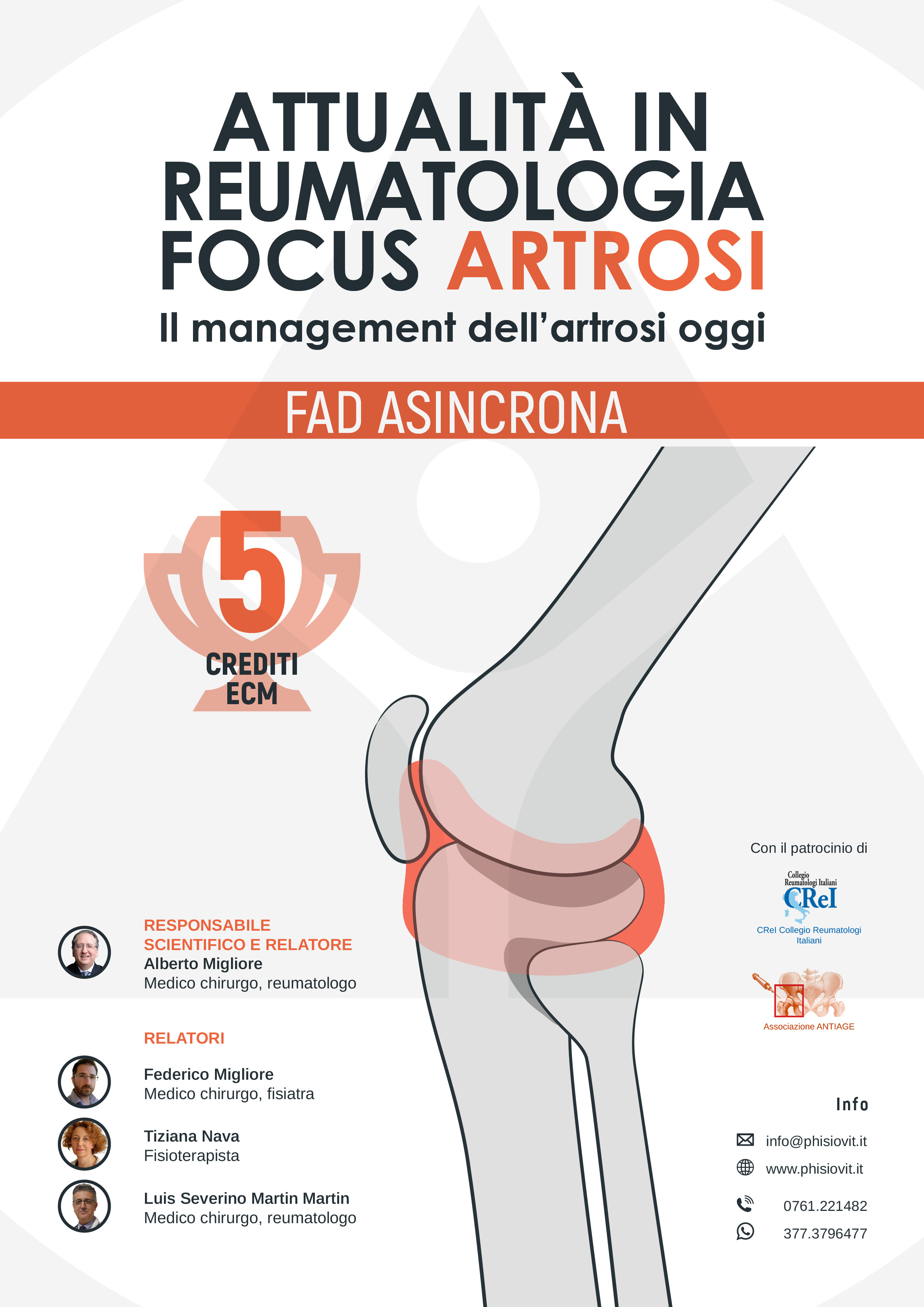 L'evento, attraverso la presentazione delle più recenti ricerche e delle ultime evidenze in tema di diagnosi ed intervento precoce nonché di terapia farmacologica e non farmacologica delle diverse fasi di malattia artrosica, corroborato dalla presentazione di casi clinici, vuole fornire ai professionisti sanitari, agli specialisti di settore e ai medici di medicina generale, linee pratiche di comportamento nel management clinico dell'artrosi.