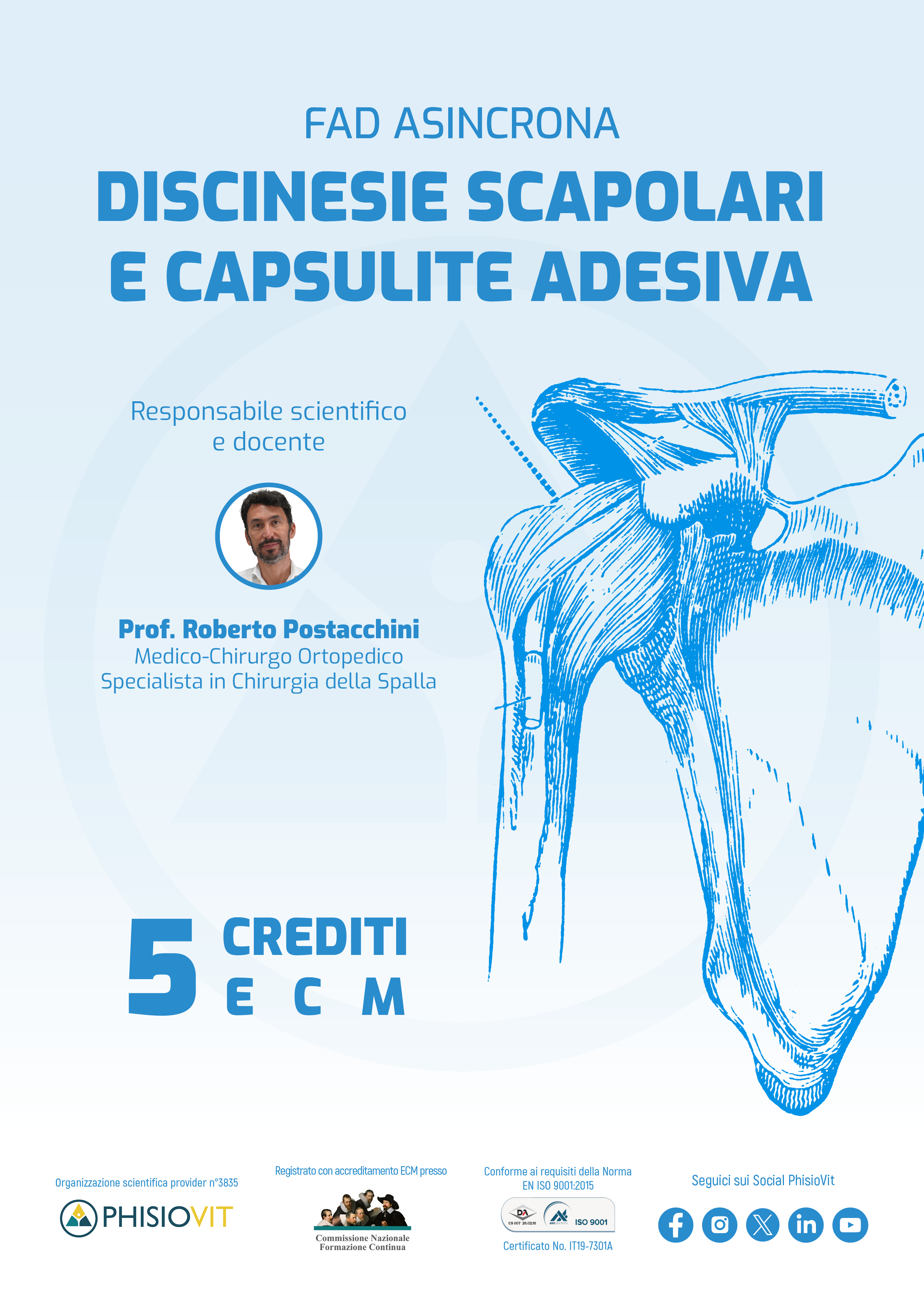 Il programma si completa con un approfondimento sul ruolo della scapola e sulla discinesia scapolo-toracica come elemento chiave nella biomeccanica e nella riabilitazione della spalla rigida.