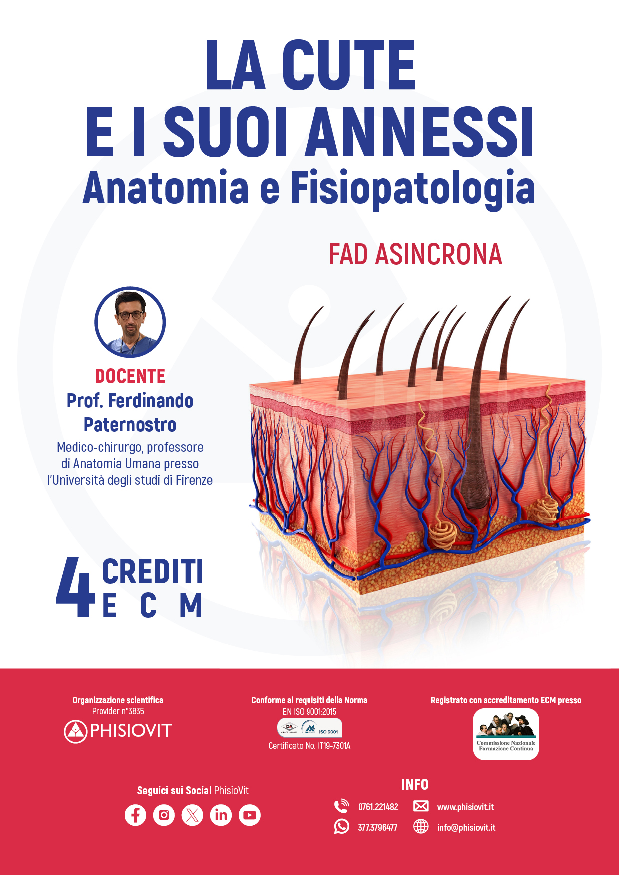 Questo corso illustra l'anatomia macroscopica e microscopica dell'organo pelle e ne descrive tutti i suoi aspetti, macroscopici e microscopici. Analizza lo spessore dei tre strati nelle varie regioni del corpo e nelle diverse età. Assieme alla forma e alla struttura viene descritta dettagliatamente la funzione e introdotti cenni di fisiopatologia. Lo studio dell'ipoderma è l'occasione per spiegare la disposizione della fascia, superficiale e profonda. La vascolarizzazione dell'organo introduce il concetto di angiosoma e dell'organizzazione anatomo-funzionale del sistema linfatico. Completa il corso lo studio dettagliato degli annessi cutanei e lo sviluppo pre, peri e post natale dell'organo. Si fa infine cenno ai meccanismi di guarigione delle ferite.