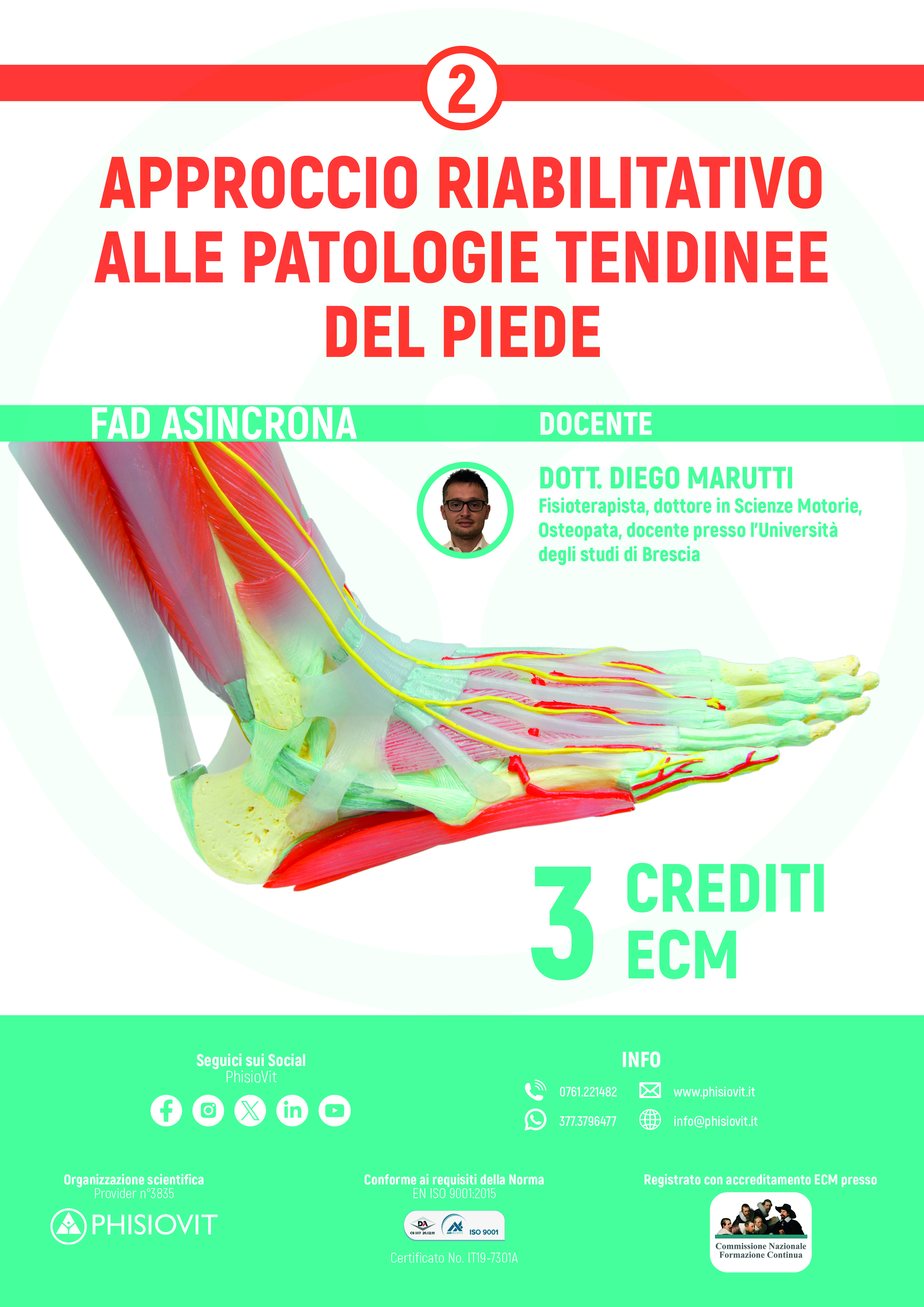 Il complesso della caviglia e del piede è una delle regioni anatomo funzionali più importanti per il controllo dell'equilibrio e della stazione eretta, tale importanza è data tra l'altro dall'alta densità recettoriale e dalla sua peculiare conformazione anatomica. Il corso nasce con lo scopo di trasmettere al discente le più importanti nozioni di trattamento manuale ed esercizio terapeutico delle principali patologie tendinee del complesso della caviglia e del piede. Particolare attenzione è rivolta allo studio dell'anatomia funzionale, all'esame anamnestico e alla valutazione differenziale al fine di impostare un set terapeutico efficace. Slide, video di test, esercizi e tecniche manuali, tabelle, grafici e schede commentati dal docente Dott. Diego Marutti, rendono unico e aggiornato questo corso a distanza.