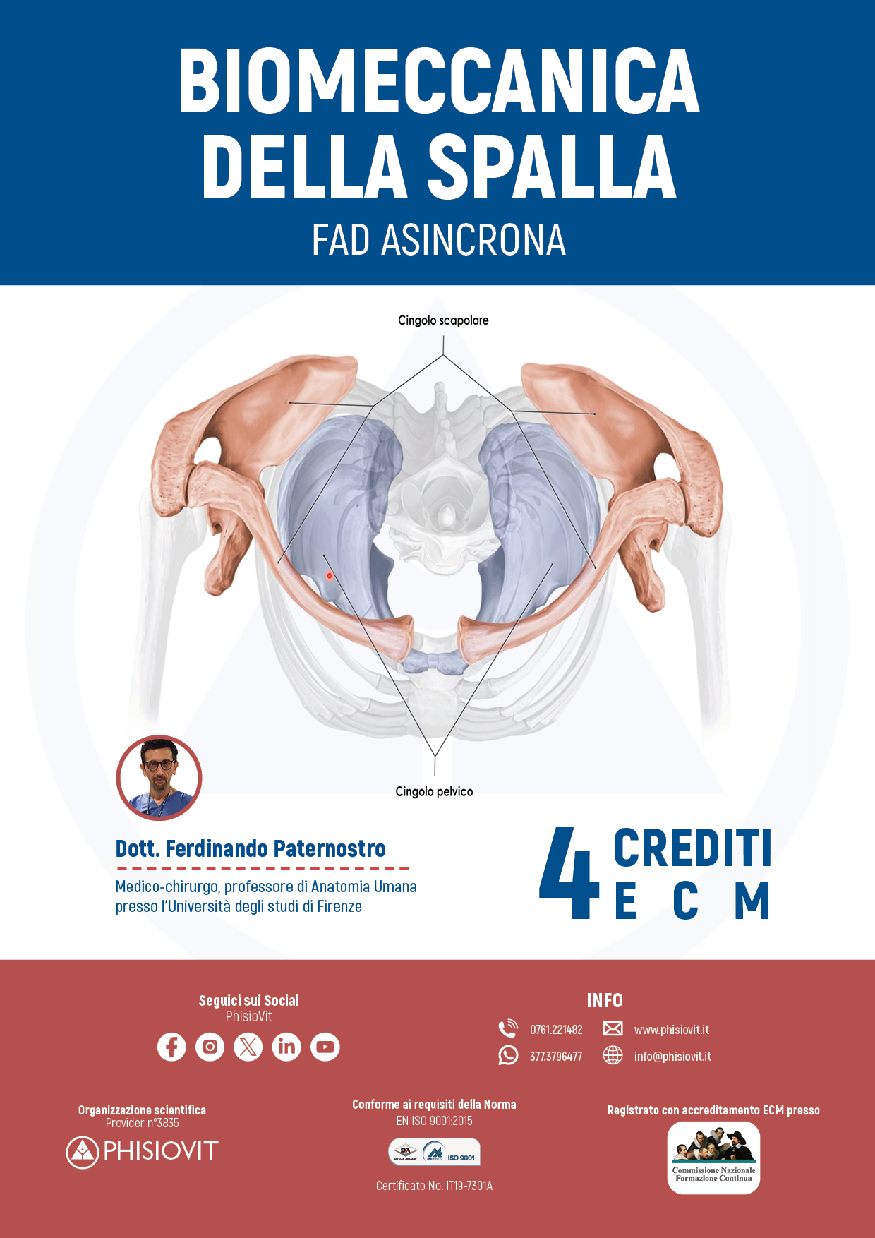 L'articolazione della spalla rappresenta, nell'ambito dell'anatomia e della biomeccanica, un argomento molto utile per la comprensione delle complesse dinamiche di movimento che presiedono alle attività motorie del corpo umano. La spalla è facilmente soggetta a traumi e infortuni vista la sua estrema mobilità e allo stesso tempo bassa stabilità. Molto spesso si va incontro a queste problematiche a causa di cattive abitudini di vita quotidiana come la sedentarietà, per un uso monotono e ripetitivo della spalla in attività poco varie dal punto di vista dell'esplorazione dei movimenti globali, di scarsa conoscenza di quelle che sono le pratiche e le manovre di carattere protettivo e preventivo da mettere in atto prima che insorga il problema. Lo scopo di questo corso a distanza è quello di portare a una buona comprensione della struttura muscolare e articolare della spalla, illustrare poi le dinamiche di movimento e le sinergie di tutte le strutture che compongono il complesso spalla per un inquadramento finale squisitamente biomeccanico.