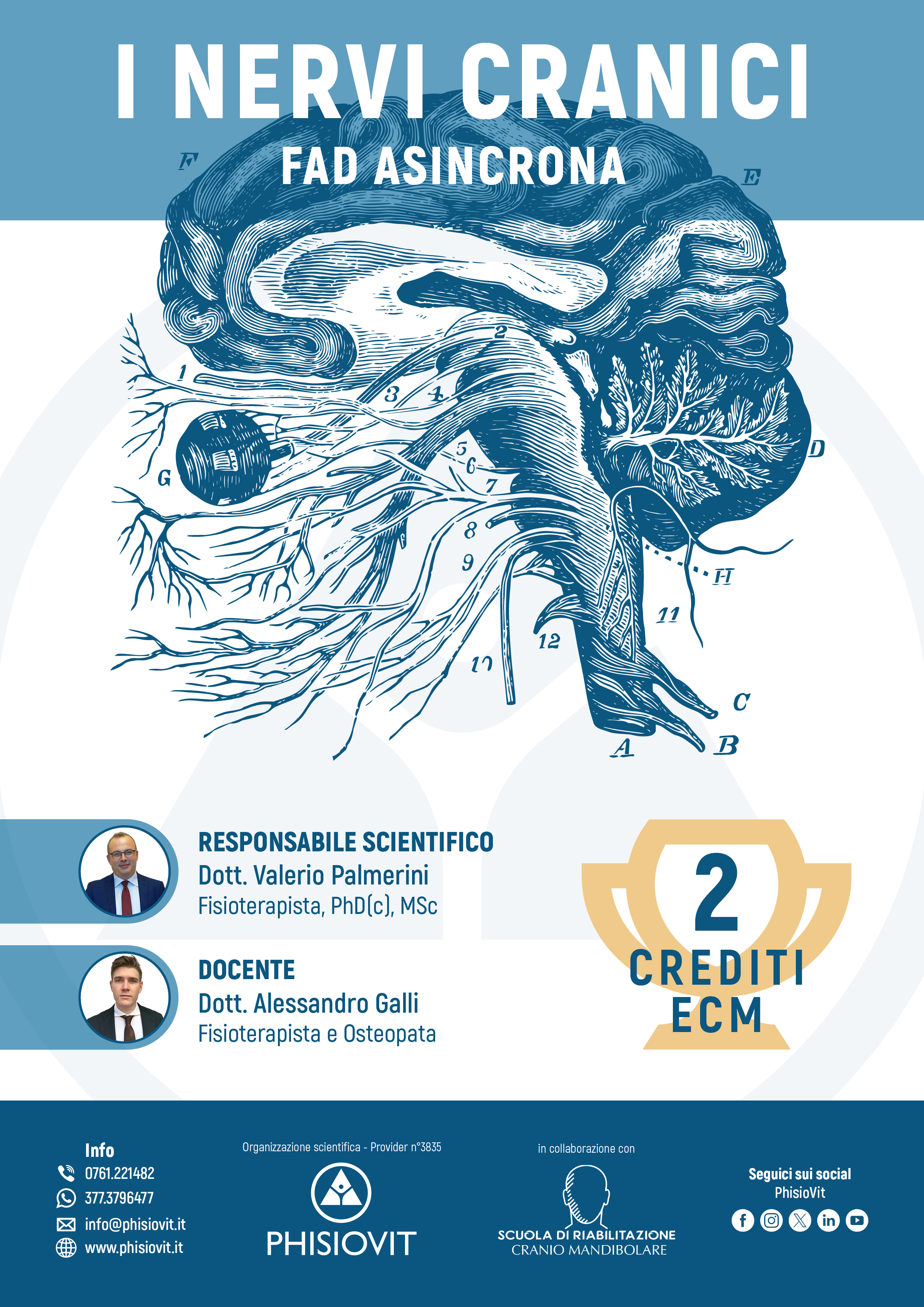 Questo corso in distance learning, realizzato in collaborazione con la Scuola di Riabilitazione Cranio Mandibolare, è un progetto formativo estremamente accurato che mira a formare i professionisti delle aree sanitarie e di quelle rieducative nello studio teorico dell'anatomia dei nervi cranici. Ideata e progettata interamente dal Dott. Alessandro Galli, fisioterapista e osteopata, questa formazione a distanza asincrona offre conoscenze dettagliate e precise sulla forma e sulla disposizione reciproca dei nervi cranici, con particolare riferimento a trigemino e faciale: tutto ciò è essenziale per comprendere i rapporti contratti dai nervi cranici con le strutture del copro umano in relazione ai disordini che possono investire l'ATM. In questo video corso viene pertanto illustrata l'anatomia dei nervi cranici in maniera chiara e briosa, ricorrendo a immersive interazioni in 3D.