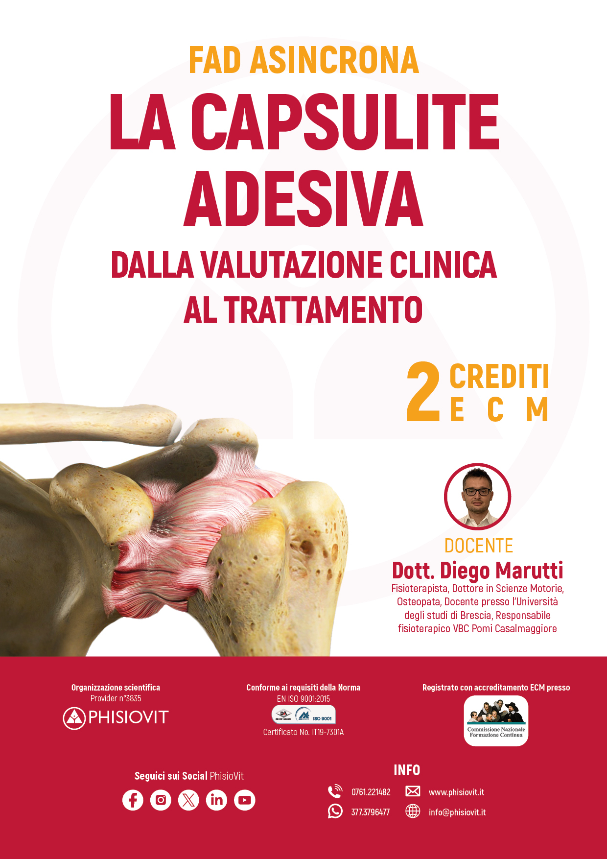 Il corso, dal titolo La Capsulite Adesiva, dalla Valutazione Clinica al Trattamento, ha una durata di due ore, di cui la visualizzazione video impegna un'ora mentre lo studio e l'apprendimento di dispense e approfondimenti (*) impegna un'ora circa. Il corso è tenuto da Diego Marutti, fisioterapista, dottore in scienze motorie, osteopata, docente presso l'Università degli studi di Brescia, responsabile fisioterapico VBC Pomi Casalmaggiore - Serie A1. L'attività didattica è svolta in un unico grande capitolo: