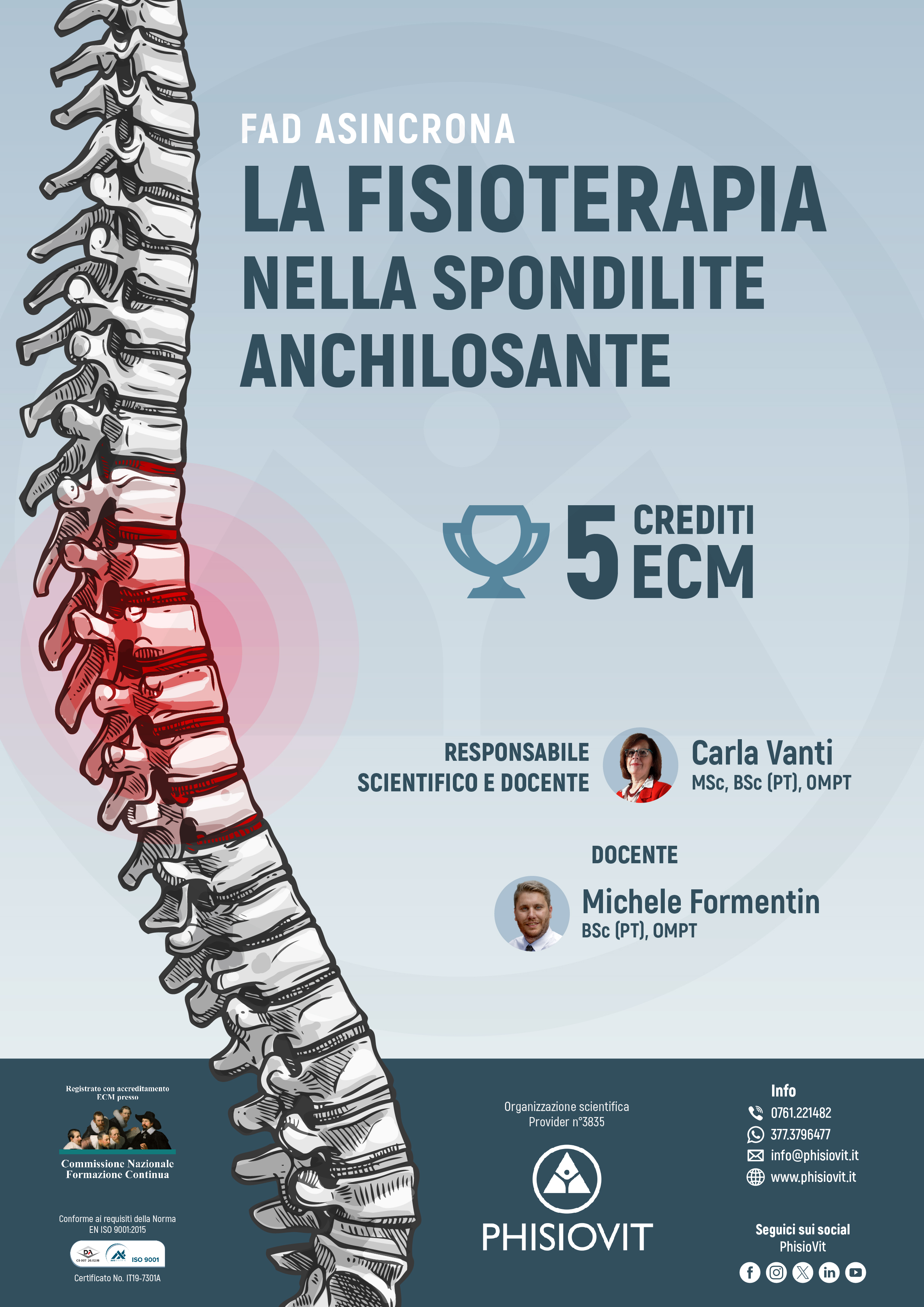 Questo corso è un prodotto didattico derivato da un webinar registrato che gli autori hanno sostenuto per il pubblico: la registrazione viene così messa a disposizione in questo corso per intero e in formato originale lasciando invariata l'interazione che c'è stata durante la diretta e che ha compreso lezioni, domande dell'uditorio e dibattito finale. Il corso si propone di fornire al partecipante un completo panorama della valutazione e del trattamento conservativo della spondilite anchilosante mediante tecniche manuali, terapie fisiche ed esercizi, integrati con un approccio informativo ed educativo. È articolato in una sessione in cui si affrontano l'inquadramento clinico, i principi terapeutici e le procedure di trattamento passivo ed attivo mirato alla specifica condizione del paziente. Il corso ha un taglio prevalentemente pratico, per fornire al partecipante un'ampia scelta di procedure terapeutiche e guidarlo al loro utilizzo mirato all'interno della propria pratica clinica.