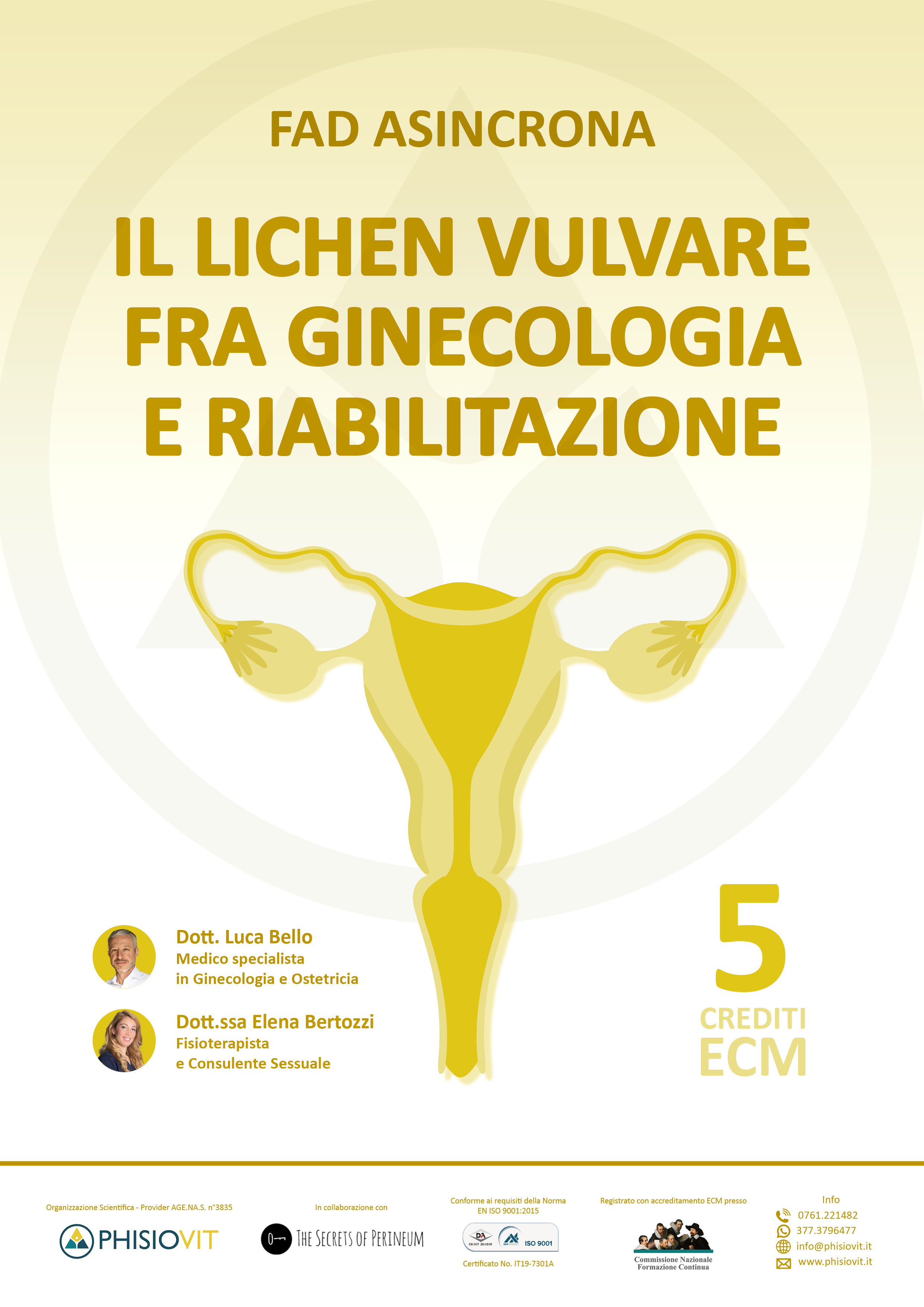 Questo corso dal titolo "Il Lichen Vulvare fra Ginecologia e Riabilitazione" è un prodotto didattico derivato da un webinar registrato che il corpo docente ha sostenuto per il pubblico: la registrazione viene così messa a disposizione in questo corso per intero e in formato originale lasciando invariata l'interazione che c'è stata durante la diretta e che ha compreso lezioni, domande dell'uditorio e dibattito finale. L'obiettivo di questo corso è quindi anzitutto quello di identificare correttamente questa patologia dal punto di vista medico-ginecologico per avere una conferma diagnostica e una terapia adeguata così da intraprendere, successivamente, un percorso riabilitativo volto a migliorare la qualità dei tessuti e la funzionalità dell'apparato con particolare attenzione alla salute sessuale, alle disfunzioni da dolore e ai conseguenti disordini del pavimento pelvico.