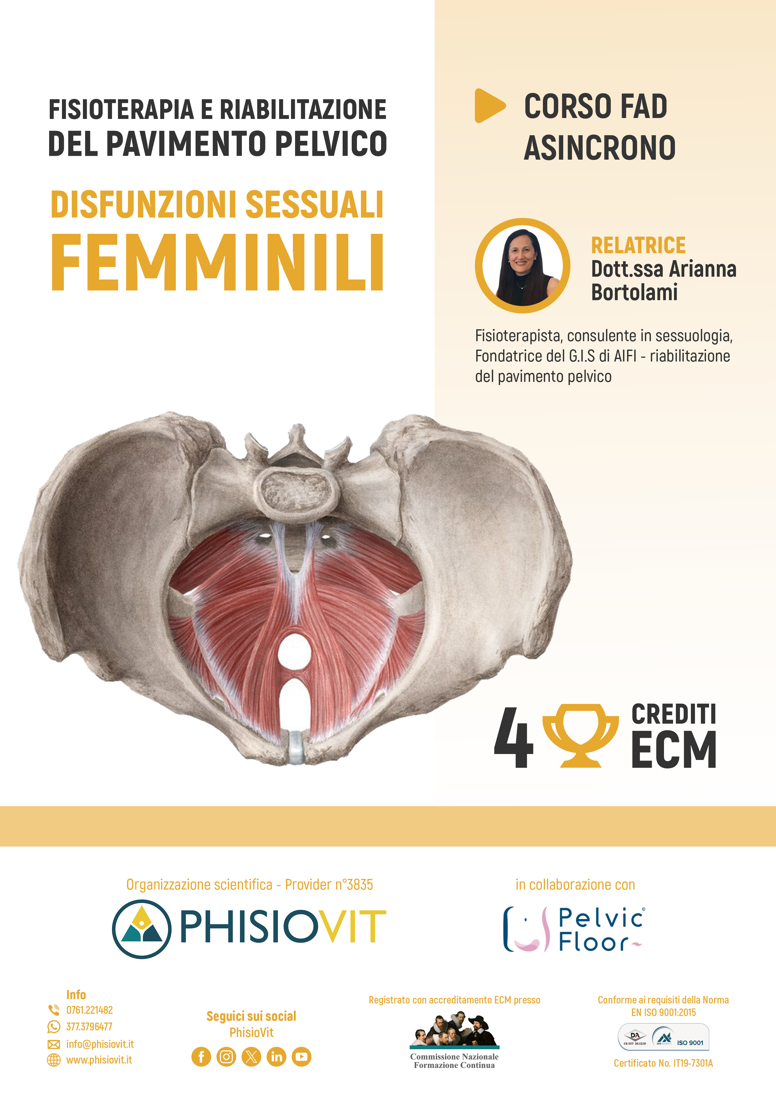 Questo corso è un prodotto didattico derivato da un webinar registrato che l'autrice ha sostenuto per il pubblico: la registrazione viene così messa a disposizione in questo corso per intero e in formato originale lasciando invariata l'interazione che c'è stata durante la diretta e che ha compreso lezioni, domande dell'uditorio e dibattito finale. Le disfunzioni sessuali femminili costituiscono un sintomo che può peggiorare in modo importante la qualità di vita della donna e, di conseguenza, del partner e della famiglia, compromettendo così la sfera personale, e talvolta sociale, della donna che ne soffre. In alcuni casi tali condizioni sono così gravi da impedire la maternità, danneggiando così ulteriormente la vita della donna e di chi le vive accanto. Il riconoscimento delle disfunzioni sessuali femminili presuppone conoscenze nell'ambito della sessuologia, disciplina che si è sviluppata negli ultimi decenni. Il pavimento pelvico costituisce uno degli elementi della funzione sessuale e la sua compromissione può essere causa primaria o secondaria della disfunzione sessuale. Ma con quali sintomi si manifestano questi disturbi? Come si effettua la diagnosi? E quali sono i trattamenti gold standard? Ne parliamo in questa FAD asincrona con la Dott.ssa Arianna Bortolami, una delle maggiori esperte italiane in questo argomento.