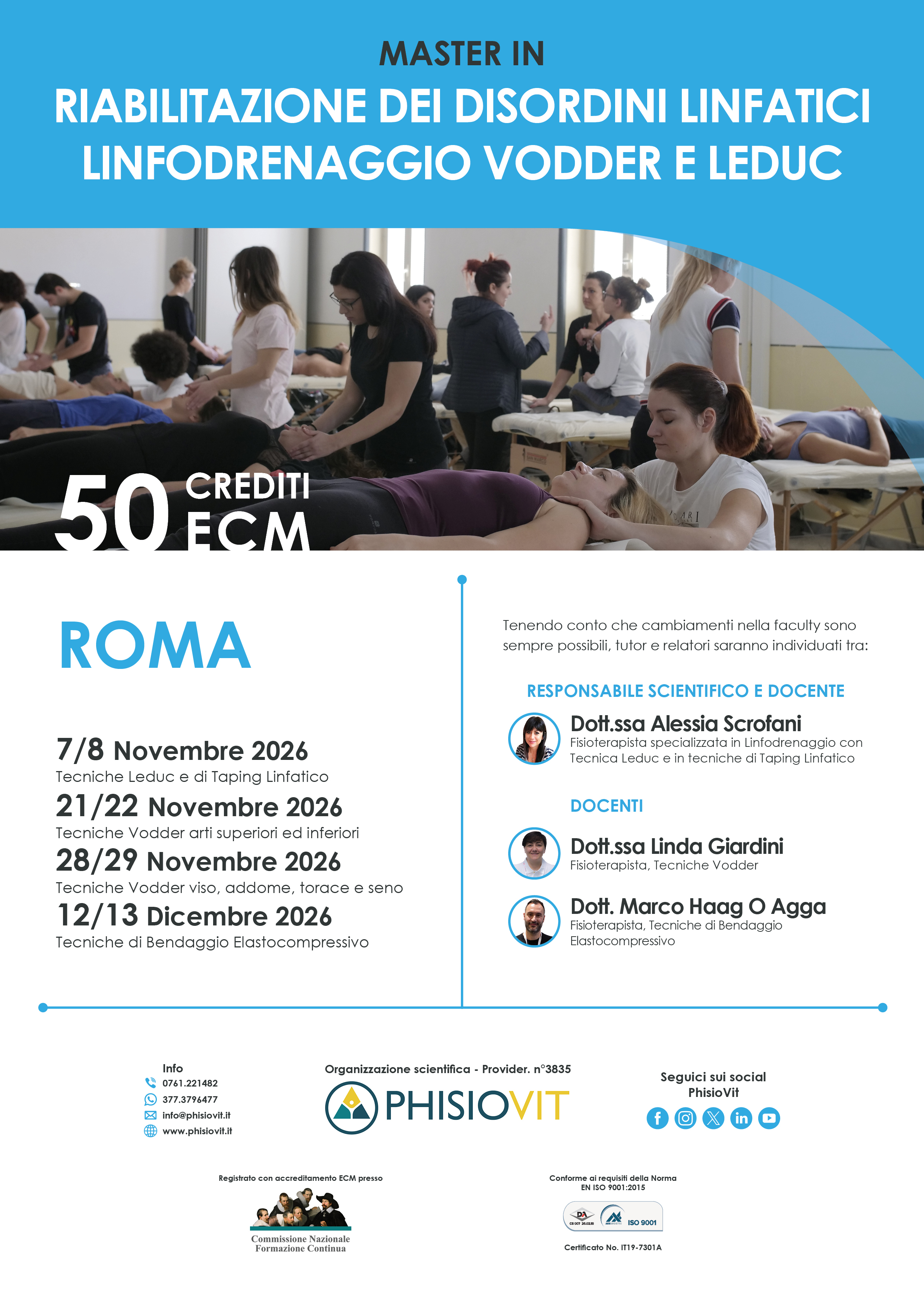 Il Master ECM in Riabilitazione dei Disordini Linfatici – Linfodrenaggio Vodder e Leduc si svolge a Roma in otto giornate non consecutive, organizzate nelle seguenti date: 7-8 novembre, 21-22 novembre, 28-29 novembre e 12-13 dicembre 2026. La responsabilità scientifica è affidata alla Dott.ssa Alessia Scrofani, fisioterapista e docente specializzata in linfologia e riabilitazione dei disordini linfatici. Il corpo docente è composto da professionisti di comprovata esperienza clinica e didattica: Dott.ssa Linda Giardini, Dott. Marco Haag O Agga, Dott.ssa Federica Cedroni, Dott. Federico Furia, Dott.ssa Giorgiana Piccarozzi e Dott.ssa Arianna Rocco, tutti fisioterapisti specializzati nelle tecniche di Linfodrenaggio Manuale secondo i metodi Vodder e Leduc, nel Taping Linfatico e nel Bendaggio Elastocompressivo. Il programma è strutturato per offrire un equilibrio tra formazione teorica e applicazione pratica, con esercitazioni cliniche guidate, discussione di casi reali e focus su protocolli di Esercizio Terapeutico sotto Compressione (ETC) secondo gli standard internazionali ISL e Lymphoedema Framework.